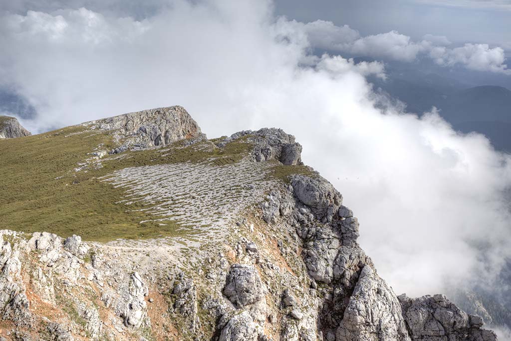 Ich ging dann noch ein Stück weiter weil sich hier ein schöner Ausblick über die Felskante runter Richtung Puchberg bot, machte dort einige Fotos und dann auf einem Stein Rast. Es zog dann immer mehr zusammen, es wurde die Sicht schlechter, es begann auch leicht zu nieseln. Ich ging dann noch 15 Minuten weiter zum Gipfelkreuz beim Klosterwappen wo es von Menschen ziemlich wuselte, man sich anstellen mußte um ein Foto vom Gipfelkreuz machen zu können. Ich fotografierte eine Gruppe von Menschen, ein Herr aus der Gruppe revanchierte sich indem er auch ein Foto von mir knipste. Der Abstieg war dann etwas beschwerlich weil der Weg aus losem Geröll bestand, ich bereute es meine Wanderstöcke zu Hause gelassen zu haben. Außerdem regnete es nun immer mehr aber zum Glück nicht aus Schaffeln.