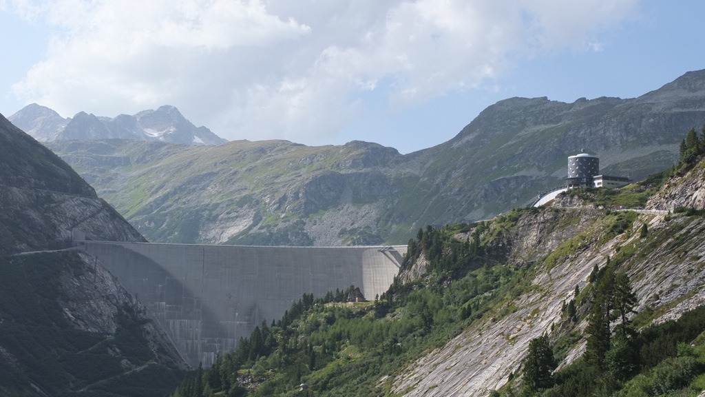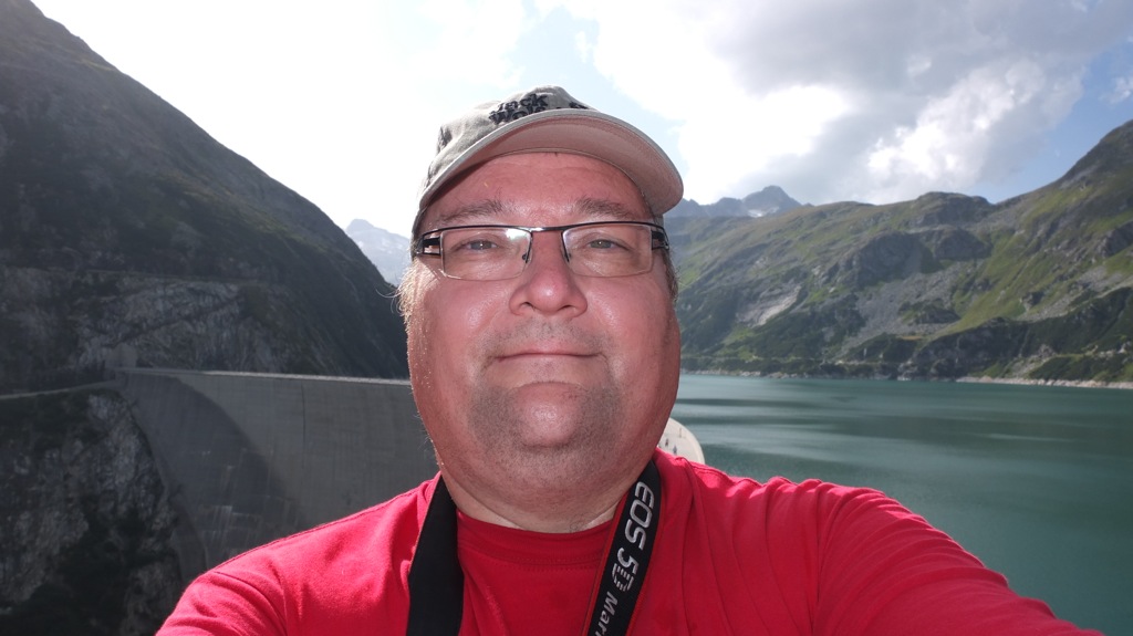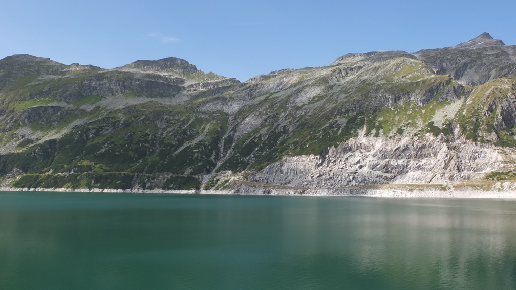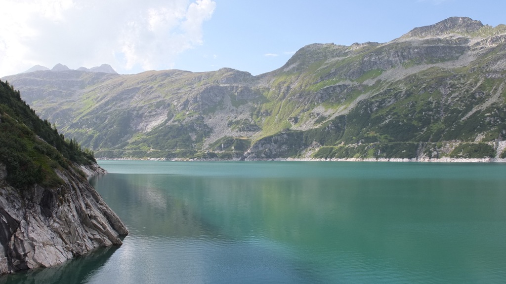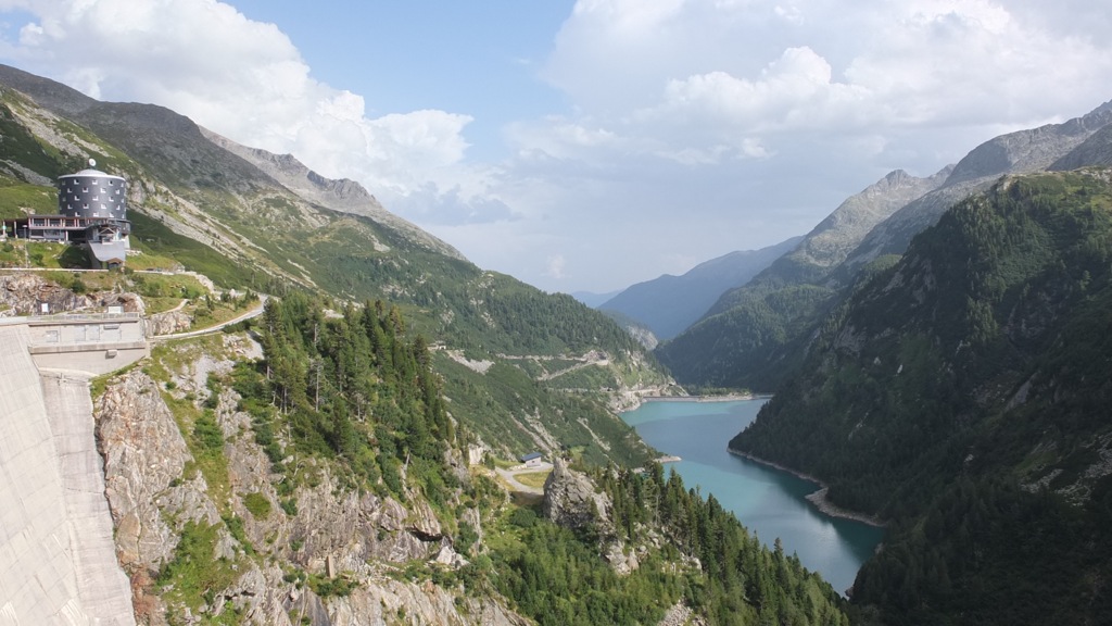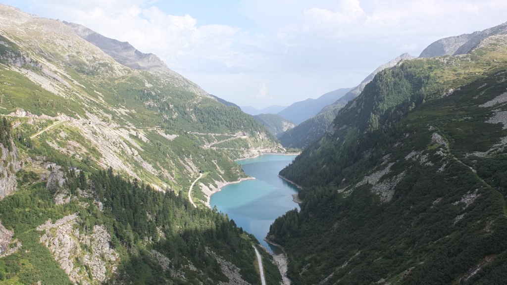 Der Ausblick oben beim Stausee war schon recht schön aber insgesamt konnte er mit den Erlebnissen entlang der Nockalmstrasse vom Vormittag nicht mithalten. Mit einer automatischen Kamera konnte man auch ein Foto von sich machen was ich natürlich gleich ausprobierte 🙂 Das Foto findet ihr hier. Auf der Staumauer ging vor mir ein Pärchen, schätzungsweise in meinem Alter die Englisch mit britischem Akzent sprachen. Als er die Kamera für ein Selbstauslöserfoto auf die Mauer positionierte fragte ich sie, ob ich sie vielleicht fotografieren darf was sie dankend annahmen. Wir kamen dann ins Gespräch, sie wohnen in Südengland, fahren mit dem Motorrad durch Belgien, Deutschland, Österreich und dann weiter nach Slowenien und Italien, es gefällt ihnen ganz ausgezeichnet. Nachdem ich noch einen Radfahrer aus Klagenfurt mit seiner Kamera auf der Staumauer fotografiert hatte machte ich mich auf den Rückweg nach Eisenkappel denn es war eh schon 17:45. Am Morgen hörte ich während des Frühstücks im Wetterbericht des Radio dass am Nachmittag im Gebiet der Nockberge die Wahrscheinlichkeit für Wärmegewitter recht hoch sein soll und tatsächlich zogen mehr und mehr Wolken auf.
